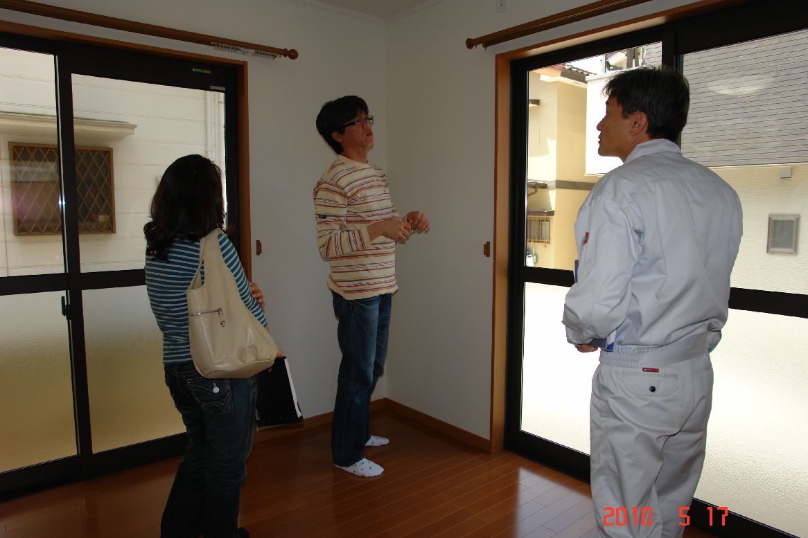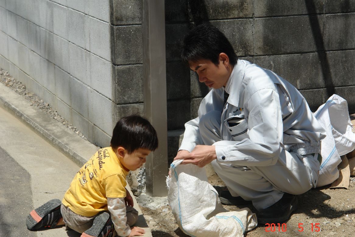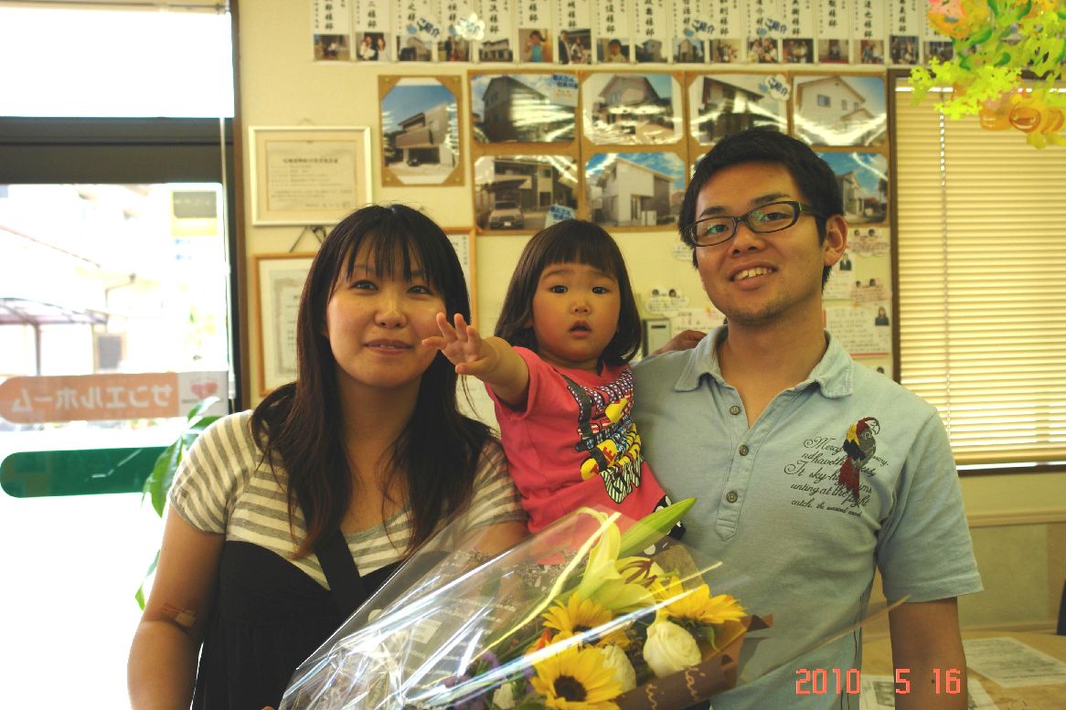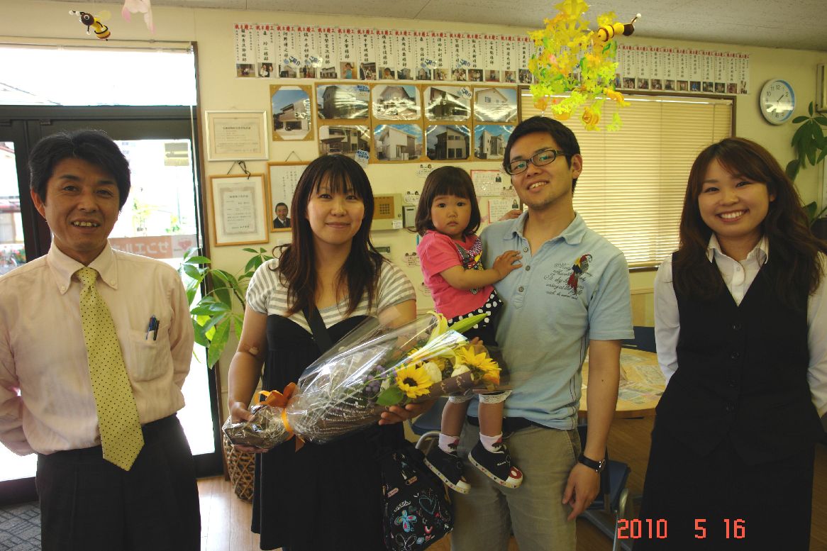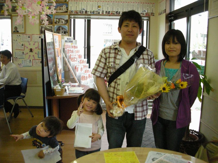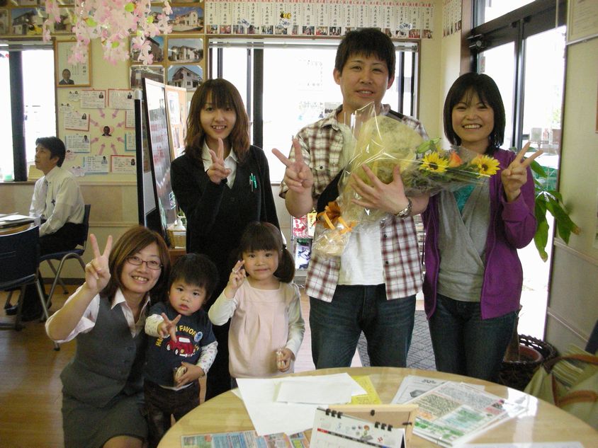 こんばんは、薫ちゃんです 昨日の嬉しい予感が的中 ワクワクの出来事をご紹介します 5/15(土)星岡町・T様邸完成 担当は、店長輝君私 ジャーンカッコイイでしょう T様邸の『菊間瓦葺き和モダンな家』が完成しました 今日はお引渡しです 仲良しのゆうき君とセレモニーの前に探検しました ゆうき君の見つめる先には・・・ ブロック工事中の職人さん 実は、エクステリア工事(お庭工事)の最中 可愛い看板を発見 あれ私達置いてないよね・・・ よーく見てみると・・・ エクステリア工事『明興さん』の看板でした お客様の幸せを心から願う明興さん 素晴らしいです 看板の通り、 職人さんからの気持ちよい挨拶 作業中もキレイ 終った後もキレイ でした 安心してお任せしています Tさん、工事の完成が楽しみですね おっと、気付くとゆうき君は輝君と一緒に・・・ お掃除してました 微笑ましい様子に温かい気持ちになりました 諸事情により、お引渡しの時間をずらして頂き、 会うと、ゆうき君は寝起きでご機嫌斜め でも、少し経つと、こんな可愛い笑顔を見せてくれましたョ また遊びに行くからね T様、これからが本当の 『生涯のお付き合い』になります 末永く宜しくお願い致します 近くなので、お散歩の時に遊びに来て下さいね そして、もう1つ・・・ 5/15 K様ご契約 担当は、ゆかりさんと私 かわいいキッズは、 ちひろちゃんとゆうと君です 二人の笑顔に、もうメロメロの私・・・ 二人と一緒に遊んでいる間、 パパとママはゆかりさんと契約の最中 帰り際にはサプライズでお祝い ブログで紹介しているのでサプライズになりませんが・・ 『そうかと思って普段と違う服を着てきました』とご主人 いつも楽しいK様です 記念にハイ、チーズ これから、幸せづくりのスタートです ワクワクしますね 家づくりを一緒に楽しみましょう K様邸の建築地は東温市田窪です また工事の様子はご紹介していきますね