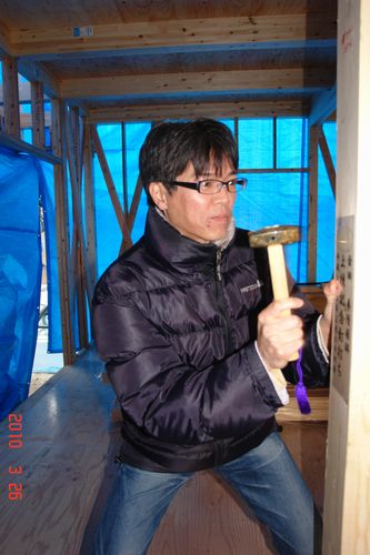 あゆ君は金づちを気に入ってしまい、とっても楽しそうに他の柱にも打っていました