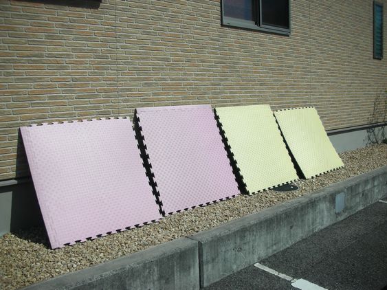 キッズコーナーのマットを洗って、お日様殺菌してます