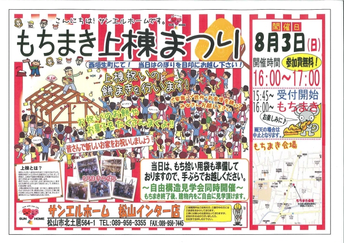 今度の日曜日 8月3日は “もちまき イベント”です ![]() ![]() ![]() 西垣生で建築中の現場をお借りして 16:00~17:00の1時間 もちまきイベントをします ![]() イベントという位ですから もちろん「もちまき」だけではありません お菓子や、タオル、ラーメンも投げちゃいます ![]() ![]() ![]() 「当りくじ」もありますよ ![]() 受付は15:45~ お近くの方は、是非来て下さいね ![]() お問い合わせは、 インター店までサンエルホーム松山インター店 m.iwamoto PR
