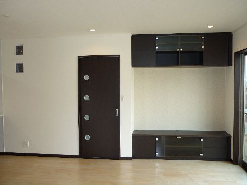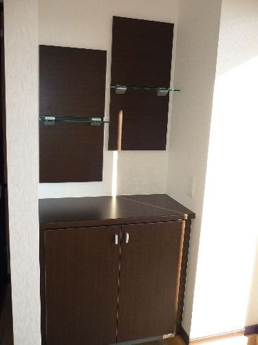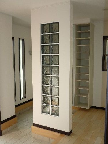 玄関を開けて直ぐにお洒落な飾り棚やガラスブロックがあります