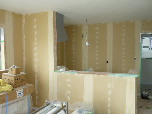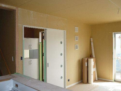 壁に白い線が沢山見えるのは、クロス(壁紙)を貼る為の前処理です